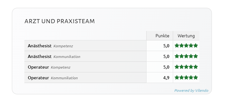 Die Vilendo-Patientenbefragung ist ein standardisiertes Instrument zur Erhebung von Rückmeldungen aus der Patienten-Perspektive. Sie dient dazu, die Erfahrungen, Zufriedenheit und Ergebnisse einer medizinischen Behandlung systematisch zu erfassen. Ziel ist es, objektive Daten zu sammeln, die dabei unterstützen, die Behandlungs- und Prozessqualität zu bewerten und kontinuierlich zu verbessern. Damit setzen wir die Patientenmeinung in den Fokus unserer Qualitätsbemühungen.